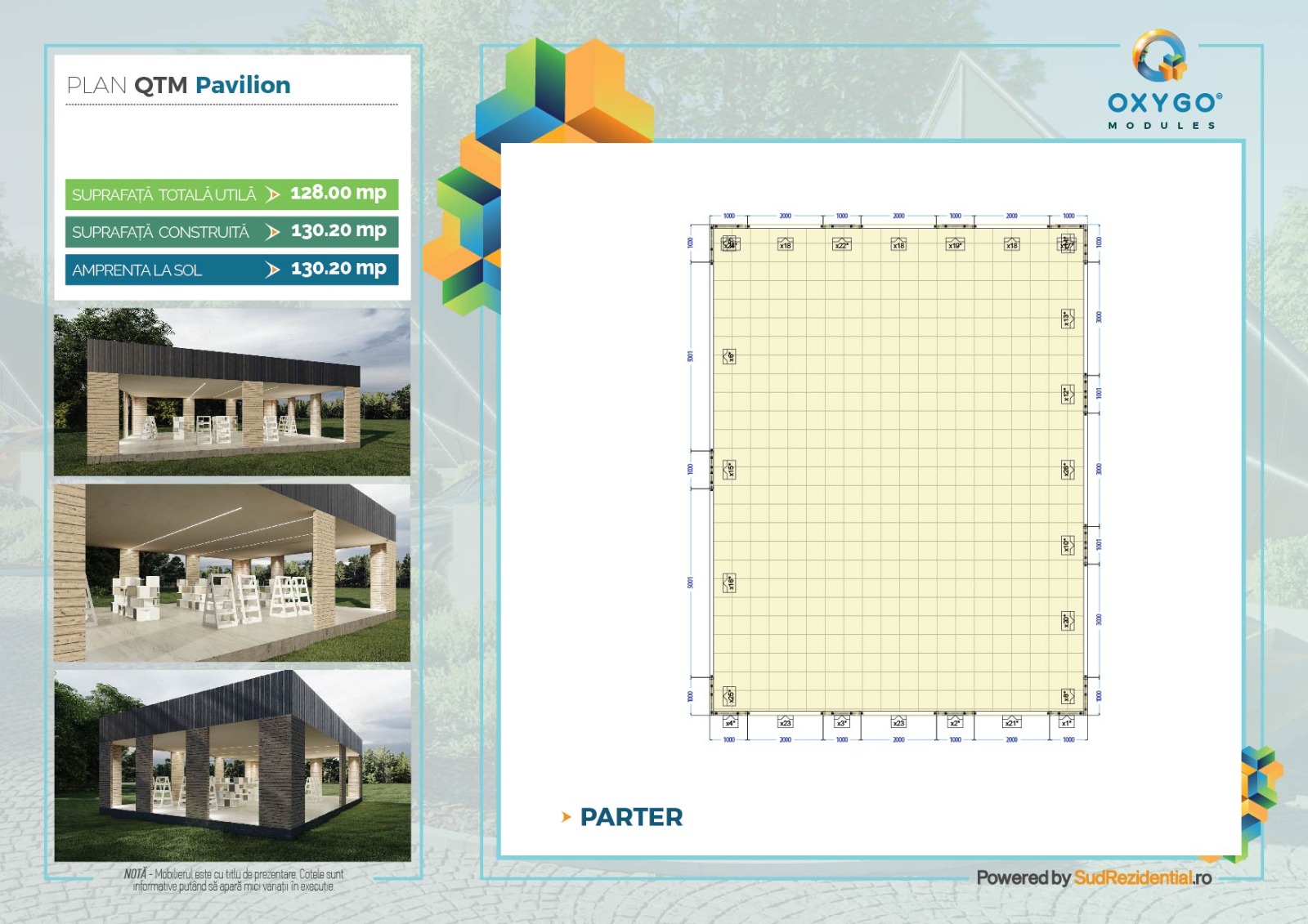 Qtm Pavilion in varianta propusa are o suprafata totala construita de 130.20 mp, dispune de un spatiu ce pote fi optimizat la maximum si chiar poate suporta cu usurinta orice modificare este necesara la interior, se poate personaliza conform cerintelor dumneavoastra, iar pentru ca foloseste structura metalica usoara, este posibila executia rapida a pieselor ce compun structura modulului si montarea acestora in doar cateva ore in locatia dumneavoastra.