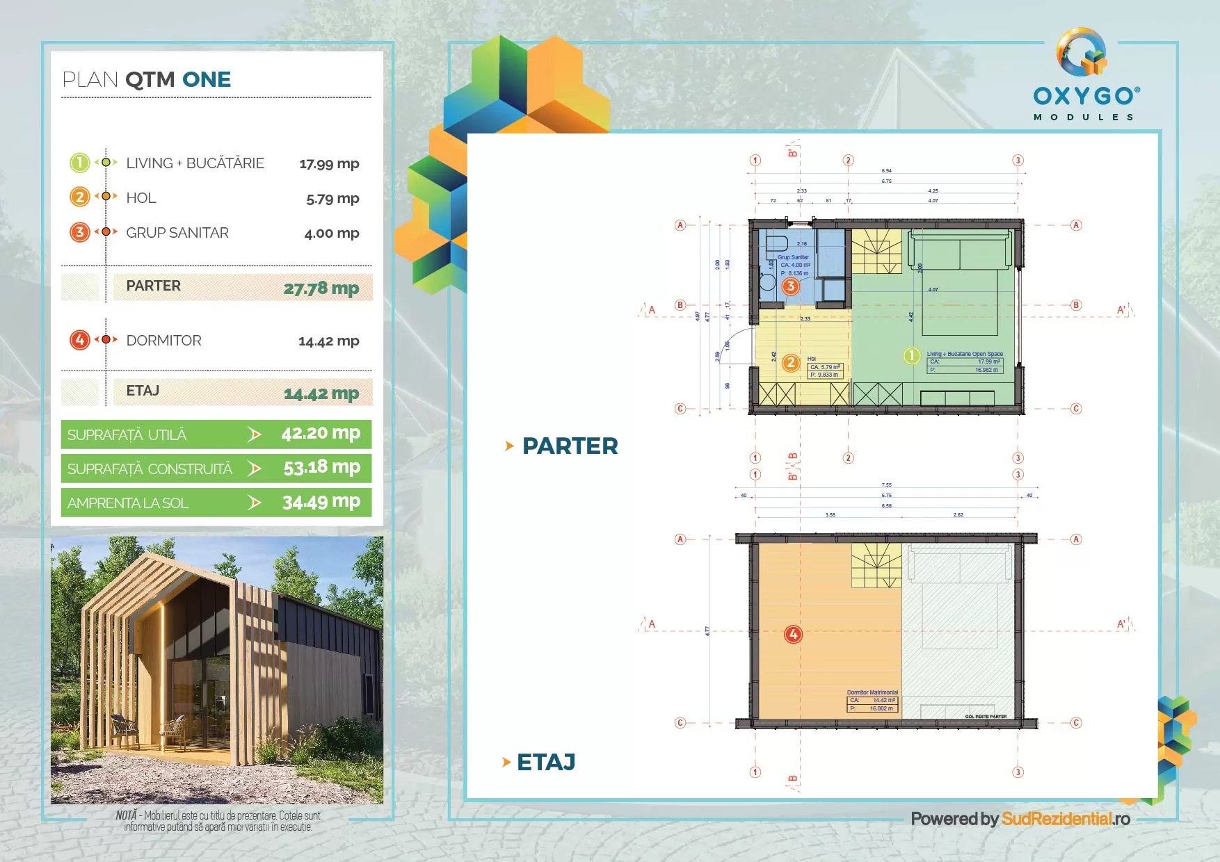 Modelul prezentat mai sus se numeste Qtm One, are o suprafata construita de 53.18 mp si se poate realiza atat pe structura metalica usoara cat si pe structura din lemn cu panouri termoizolate SIP.
